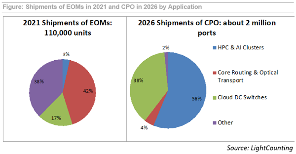早在2010年,HPC就率先使用了大量EOM,此后生產(chǎn)的EOM都不是標準解決方案。這當然是EOM未實現(xiàn)大量應用的原因之一,對于CPO供應商來說也是一個經(jīng)驗教訓。2021年,EOM的大部分都用于軍事和航空航天系統(tǒng)(圖中顯示為“其他”)。這些是利基市場,規(guī)模太小還不足以為此制定標準。所以這一個“走得快”但沒有計劃“走得遠”的例子。