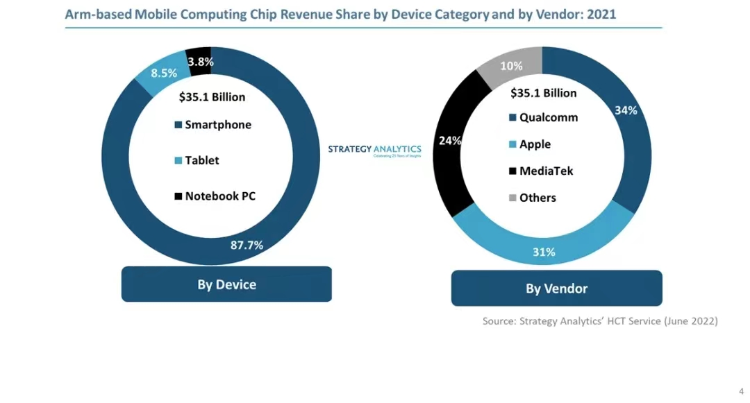 Strategy Analytics數(shù)據(jù)顯示,2021年,智能手機、平板電腦和筆記本電腦處理器分別占基于Arm的移動計算芯片總營收的88%、9%和3%。基于Arm的移動計算市場在營收和出貨量上都超過基于x86的移動計算市場。2021年,基于Arm的移動計算芯片的總收益比x86(不包括芯片組和離散GPU)高出近20%。