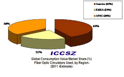 據(jù)ElectroniCast預(yù)測(cè),2010-2015年期間光纖環(huán)形器平均每年增長(zhǎng)率將達(dá)14.29%。2011年,美洲地區(qū)(中部、北美和南美)將占據(jù)較大市場(chǎng)份額(如圖);但是2015年之前,亞太地區(qū)(APAC)的光纖環(huán)形器消費(fèi)價(jià)值將開(kāi)始占據(jù)市場(chǎng)領(lǐng)導(dǎo)地位。