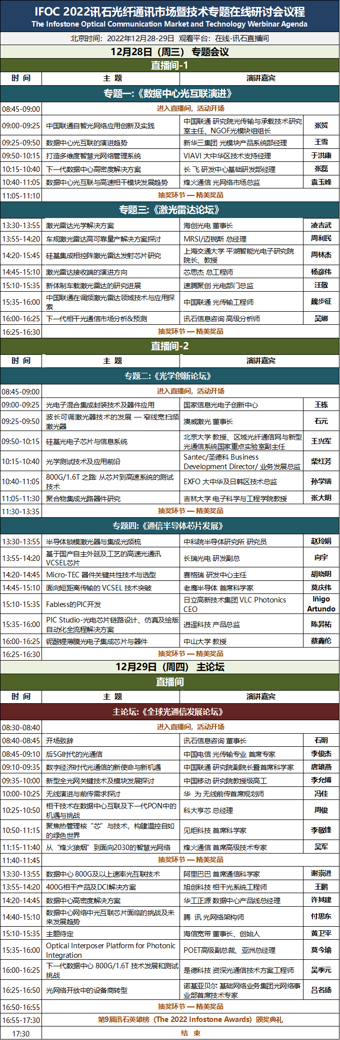 本次在線研討會將光通信盛會IFOC 2022的行業(yè)頂級講師陣容邀請至直播間,為光通信從業(yè)人員帶來精彩演講,更有行業(yè)領先公司專家代表分享最新技術與市場發(fā)展趨勢。會議從五大專題深入探討覆蓋整個光通訊市場的全面內(nèi)容,層層遞進式分析技術發(fā)展趨勢,深度融入熱點話題,為行業(yè)發(fā)展注入新鮮力量。本次直播面向全光通信從業(yè)人員開放觀看,歡迎關注。