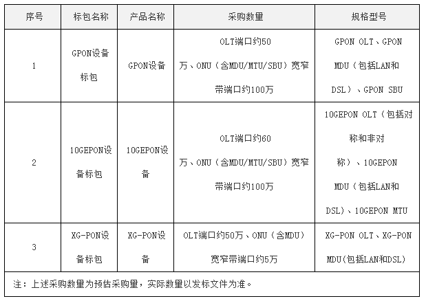 公告顯示,中國電信PON設(shè)備(2018年)集中招標(biāo)主要分GPON、10GEPON、XG-PON設(shè)備三個(gè)標(biāo)包,其中①GPON設(shè)備標(biāo)包采購OLT端口約50萬、ONU(含MDU/MTU/SBU)寬窄帶端口約100萬,規(guī)格型號包括GPON OLT、GPON MDU(包括LAN和DSL)、GPON SBU;②10GEPON設(shè)備標(biāo)包,采購OLT端口約60萬、ONU(含MDU/MTU/SBU)寬窄帶端口約100萬,規(guī)格型號包括10GEPON OLT(包括對稱和非對稱)、10GEPON MDU(包括LAN和DSL)、10GEPON MTU;③XG-PON設(shè)備標(biāo)包,采購的是OLT端口約50萬、ONU(含MDU)寬窄帶端口約5萬,規(guī)格型號有XG-PON OLT、XG-PON MDU(包括LAN和DSL)。