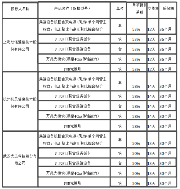 中國移動(dòng)2018年GPON設(shè)備(新建部分集采)集采標(biāo)段二、三的中標(biāo)候選人中標(biāo)情況如下:
