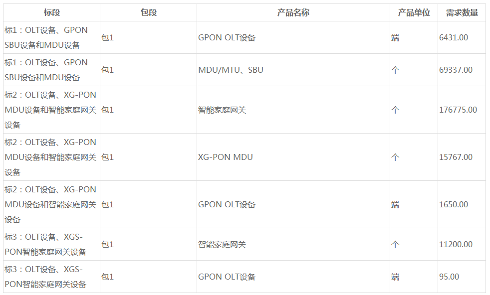 標(biāo)段一:OLT設(shè)備6431端,GPON SBU設(shè)備650端,MDU設(shè)備68687端;