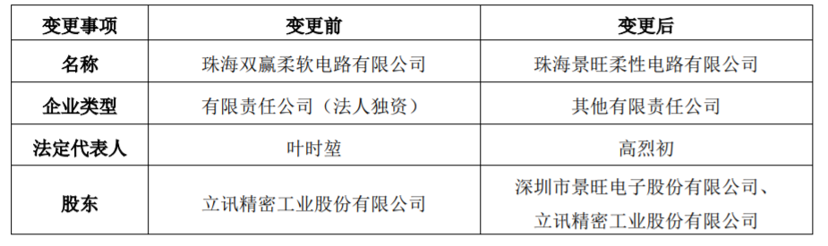 目前,珠海雙贏已完成工商變更登記手續(xù),公司名稱已由珠海雙贏柔軟電路有限公司變更為珠海景旺柔性電路有限公司(以下簡稱“珠海景旺柔性”)主要變更登記事項(xiàng)如下: