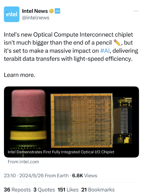 英特爾OCI(光學(xué)計(jì)算互連)芯粒