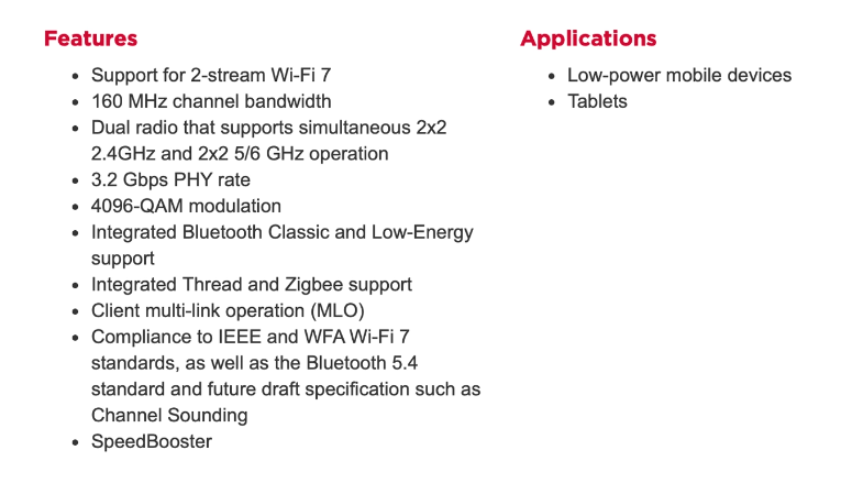 客戶端方案為 BCM4390,可替代去年推出的 BCM4398,支持 2.4 GHz 和 5 GHz 或 6 GHz 頻段,但信道寬度支持從 320 MHz 減少到 160 MHz。PHY 速率為 3.2 Gbps。此外,BCM4390 集成藍(lán)牙 Denver、Thread 和 Zigbee 支持。新的 BCM4390 還支持博通專有的 SpeedBooster 技術(shù)。
