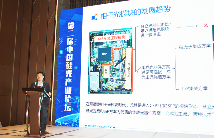 烽火通信系統(tǒng)部產(chǎn)品經(jīng)理曹權(quán)博士發(fā)表《光傳輸系統(tǒng)中的硅光技術(shù)應(yīng)用需求》,曹博士表示相干光傳輸?shù)膯文K容量正在進入400G/800G時代,其應(yīng)用不僅局限在長途傳輸,會擴展到DCI互聯(lián)應(yīng)用。然而,傳統(tǒng)的分立光器件已經(jīng)不能支持CFP2的可插拔演進(小型化)。因此,他看好硅光子和InP的集成光子學(xué)技術(shù)是未來相干模塊的關(guān)鍵技術(shù)。