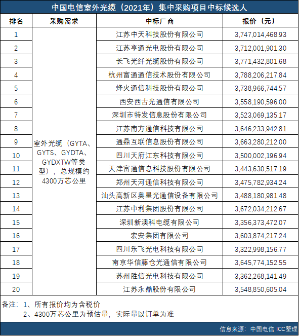 ICC訊 1月27日,中國電信公布室外光纜(2021年)集中采購項目中標候選人結果,中天、亨通、長飛、富通、烽火、特發(fā)、通鼎、永鼎等20家廠商中標入圍,具體排名和報價如下。