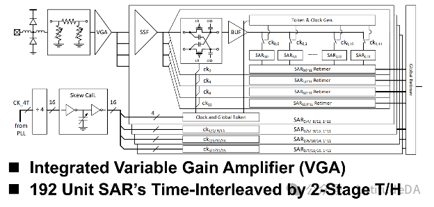 ADC 設(shè)計采用時間交錯架構(gòu),以實現(xiàn) 105GSps 的目標采樣率。如圖 2 所示,ADC 由 192 個單元逐次逼近寄存器 (SAR) ADC 組成,這些 ADC 采用兩級跟蹤保持 (T/H) 電路進行時間交錯。輸入信號首先由集成了失真消除電路的可變增益放大器 (VGA) 放大,以獲得高線性度。