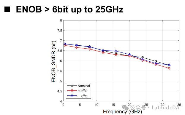 600Gbps DP-QAM64 相干光收發(fā)器前端與 DSP 模塊集成在 16nm CMOS 工藝中,表現(xiàn)出令人印象深刻的性能指標。如圖 10 所示,模數(shù)轉(zhuǎn)換器的帶寬超過 40GHz,有效位數(shù) (ENOB) 超過 6 位,最高可達 25GHz。通過失真消除電路,無雜散動態(tài)范圍 (SFDR) 超過 50.7dB,通過片上校準,交錯脈沖被抑制在 -60dB 以下(圖 11)。