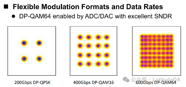 光通信系統(tǒng)對更高的數(shù)據(jù)傳輸速率的需求不斷增長,推動了對先進調(diào)制格式和高性能收發(fā)器的需求。要實現(xiàn)每波長 400Gbps 以上的數(shù)據(jù)傳輸速率,有前景的解決方案是采用復(fù)雜的調(diào)制方案,如雙偏振正交幅度調(diào)制(DP-QAM64)。這種調(diào)制格式通過為每個符號編碼更多比特來提供更高的頻譜效率,從而在電氣和光學信道的有限帶寬內(nèi)實現(xiàn)更高的數(shù)據(jù)傳輸速率。