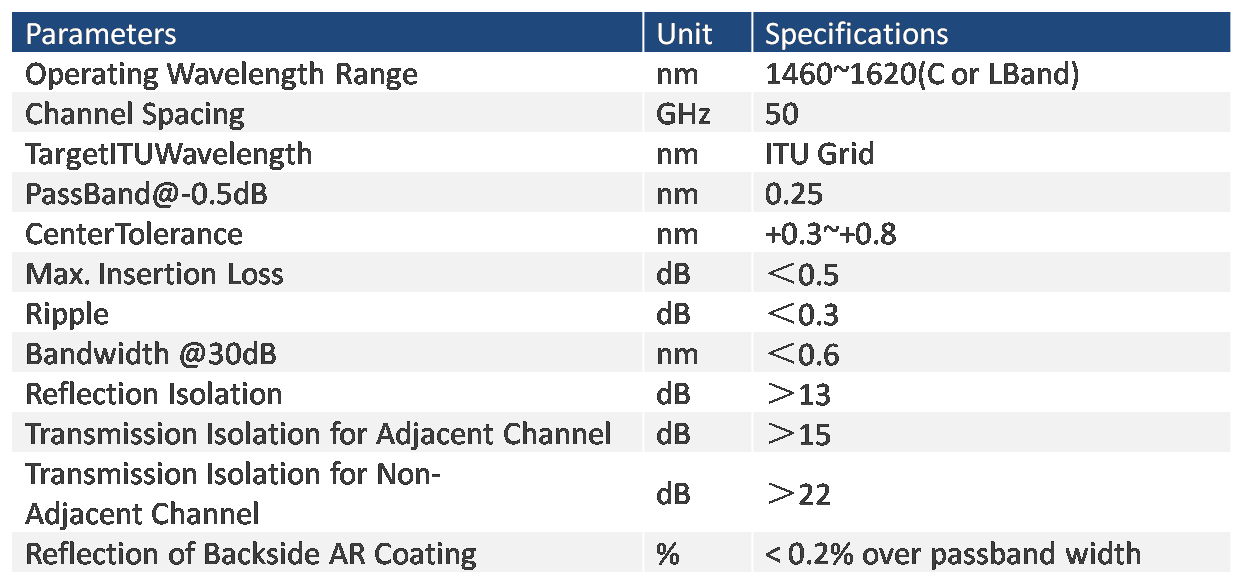 新開(kāi)發(fā)的濾波片基于50GHz的ITU-T通道間隔,波長(zhǎng)范圍覆蓋C或L波段,在光通信波長(zhǎng)1260~1620nm范圍定可定制。設(shè)計(jì)工作溫度為工業(yè)級(jí) -40℃~+85 ℃,全溫范圍內(nèi)波長(zhǎng)溫度偏移控制在0.02nm以下,可在較嚴(yán)苛的溫度環(huán)境下工作。產(chǎn)品面向波分光傳輸網(wǎng)絡(luò)市場(chǎng),可廣泛應(yīng)用于N×10G/25G/100G/200G/400G等OADM、OTN和CRAN ORAN等通信網(wǎng)絡(luò)節(jié)點(diǎn)。