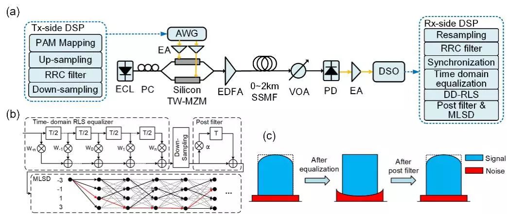 圖2 (a)實驗結構圖與發(fā)射接收端數(shù)字信號處理算法;(b)時域RLS均衡、數(shù)字后濾波器、最大似然檢測的算法流程圖;(c)不同數(shù)字信號處理階段的信號和噪聲譜示意圖。