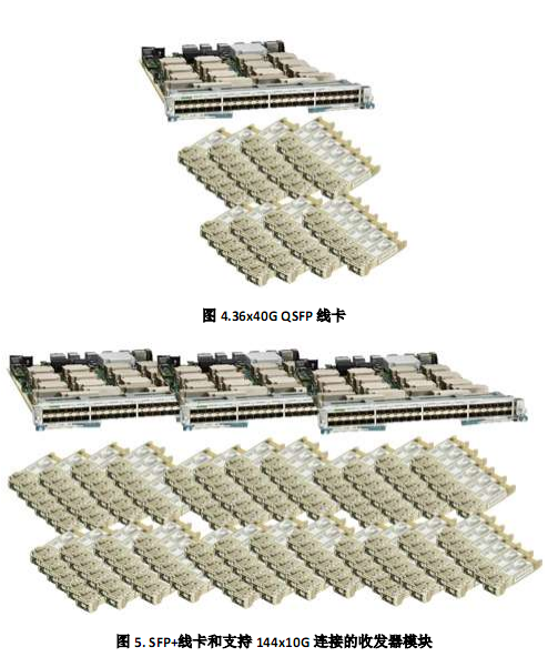 如前所述,端口分支模式下的36端口40G QSFP線(xiàn)卡支持總共144個(gè)10G鏈路,因?yàn)槊總€(gè)40G端口可充當(dāng)4個(gè)10G鏈路。 為支持與傳統(tǒng)SFP +收發(fā)器相同數(shù)量的10G鏈路,需要3個(gè)48端口的SFP +線(xiàn)卡,如圖5所示。 隨著10G端口容量需求量的增加,這種影響將繼續(xù)增長(zhǎng)。對(duì)于每個(gè)裝滿(mǎn)40G線(xiàn)卡的機(jī)箱,在10G端口分支模式下運(yùn)行,如果網(wǎng)絡(luò)是使用傳統(tǒng)48端口的10G SFP +線(xiàn)卡構(gòu)建的,則需要三個(gè)機(jī)箱。 通過(guò)部署40G線(xiàn)卡,數(shù)據(jù)中心的占用空間大幅下降。