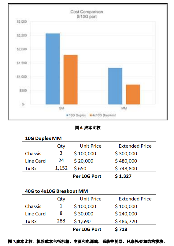 我們?cè)u(píng)估了一個(gè)帶有8插槽機(jī)箱的場(chǎng)景,其中滿(mǎn)配了36端口的QSFP線(xiàn)卡。線(xiàn)卡上裝有40G并行光學(xué)收發(fā)器,以分線(xiàn)模式運(yùn)行,機(jī)箱總端口數(shù)為1152個(gè)10G端口。使用10G SFP +線(xiàn)卡實(shí)現(xiàn)等效的10G端口容量,需要總共三個(gè)八插槽機(jī)箱和48端口的線(xiàn)卡。成本比較包括使用所有組件的標(biāo)準(zhǔn)列表定價(jià)的交換機(jī)機(jī)箱,線(xiàn)卡和相關(guān)收發(fā)器的成本。圖6中的機(jī)箱成本包括所需的電源,風(fēng)扇托架,監(jiān)控器,系統(tǒng)控制器和結(jié)構(gòu)模塊。由于在使用SFP +收發(fā)器時(shí)支持10G端口密度所需的機(jī)箱數(shù)量增加,因此這些額外所需的組件也會(huì)增加。因此,該研究表明,在每個(gè)端口的基礎(chǔ)上,與在多模應(yīng)用的端口分支模式下部署40G端口相比,部署獨(dú)立10G端口的成本幾乎高出了85%。圖6和7分別以圖形和表格的形式顯示結(jié)果。