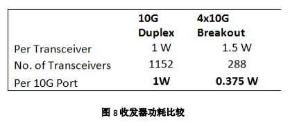 現(xiàn)在讓我們?cè)u(píng)估一下對(duì)運(yùn)營(yíng)支出的好處。 首先,大多數(shù)供應(yīng)商的40G和10G交換機(jī)機(jī)箱和線(xiàn)卡具有相似的功率要求。 除了上面討論的空間節(jié)省之外,所需的功率和冷卻減少約67%,因?yàn)闄C(jī)箱和線(xiàn)卡的數(shù)量減少了三分之二。 另外,我們可以節(jié)省運(yùn)行收發(fā)器所需的額外功率。圖8中的數(shù)據(jù)顯示,在部署多模端口分支配置時(shí),收發(fā)器功耗節(jié)省超過(guò)60%。