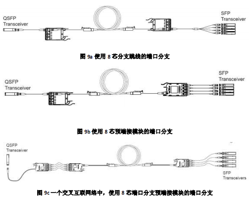 由于并行光纖收發(fā)器可在 8 芯光纖上運(yùn)行,因此考慮如何設(shè)計(jì)數(shù)據(jù)中心結(jié)構(gòu)化布線(xiàn)以支持端口分支模式非常重要。推薦的設(shè)計(jì)包括為光學(xué)基礎(chǔ)設(shè)施采用 Base-8 MTP 連接以?xún)?yōu)化光纖利用率和端口映射的解決方案。 如圖9a,9b 和9c 所示,部署與 8 芯 MTP 連接器接口的連接允許端口分支到四個(gè)LC 雙工端口,用于連接到10G 設(shè)備端口,這是簡(jiǎn)單和優(yōu)化的解決方案。