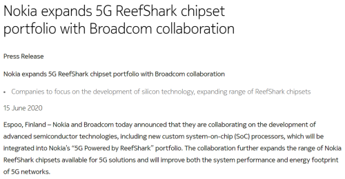 諾基亞已經(jīng)引進(jìn)了芯片制造商Marvell,并于英特爾達(dá)成了一項(xiàng)新協(xié)議。本周一(6月15日),諾基亞宣布與博通合作開發(fā)先進(jìn)的半導(dǎo)體技術(shù),包括將集成到諾基亞“ReefShark驅(qū)動(dòng)的5G”產(chǎn)品組合中的新的定制系統(tǒng)級芯片(SoC)處理器。此次合作將進(jìn)一步擴(kuò)大諾基亞應(yīng)用于5G解決方案的ReefShark芯片組組合,并將提升5G網(wǎng)絡(luò)的系統(tǒng)性能和改善5G網(wǎng)絡(luò)的能耗。
