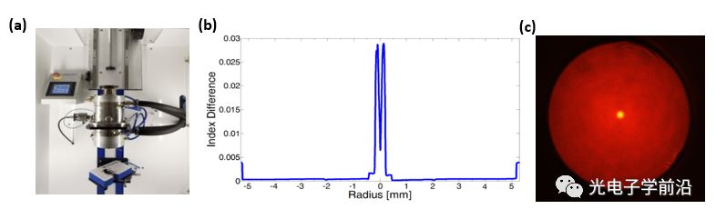 圖2. (a) 新南威爾士大學(xué)國家聯(lián)合光纖制造設(shè)施中的光纖拉絲塔;(b)采用改進的化學(xué)氣相沉積(MCVD)和原位溶液摻雜技術(shù)制備的第一根鉍鉺共摻光纖預(yù)制棒的折射率分布;(c)鉍鉺共摻光纖的橫截面