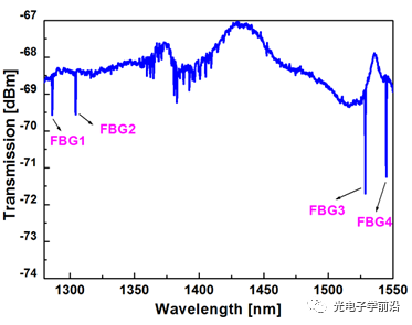圖4. 基于鉍鉺共摻光纖的4個級聯(lián)布拉格光柵(相隔 >250 nm)的超寬帶透射譜