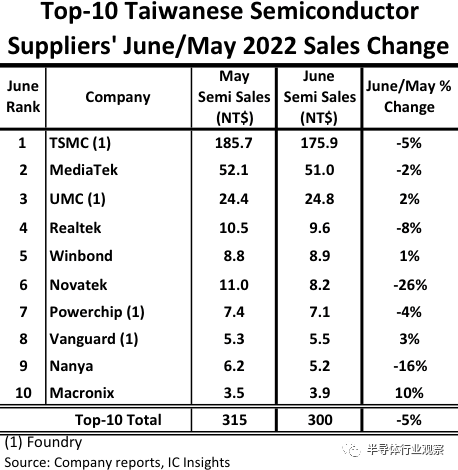 圖1 顯示臺(tái)灣前 10 位半導(dǎo)體供應(yīng)商 6 月/5 月的銷售業(yè)績??傮w而言,這 10 家公司 6 月份的半導(dǎo)體銷售額較 5 月份下降了 5%,其中包括臺(tái)積電在內(nèi)的四大公司中有 3 家出現(xiàn)下滑。尤其令人擔(dān)憂的是,之前的“高手”Novatek 在 6 月/5 月的銷售額急劇下降了 26%(該公司公布的 2021/2020 年銷售額增長了 78%)。另請注意 DRAM 供應(yīng)商 Nanya 在 6 月/5 月的銷售額下降了 16%,這可能證實(shí)了美光在 6 月 30 日的指導(dǎo)中暗示的可怕的內(nèi)存市場前景。