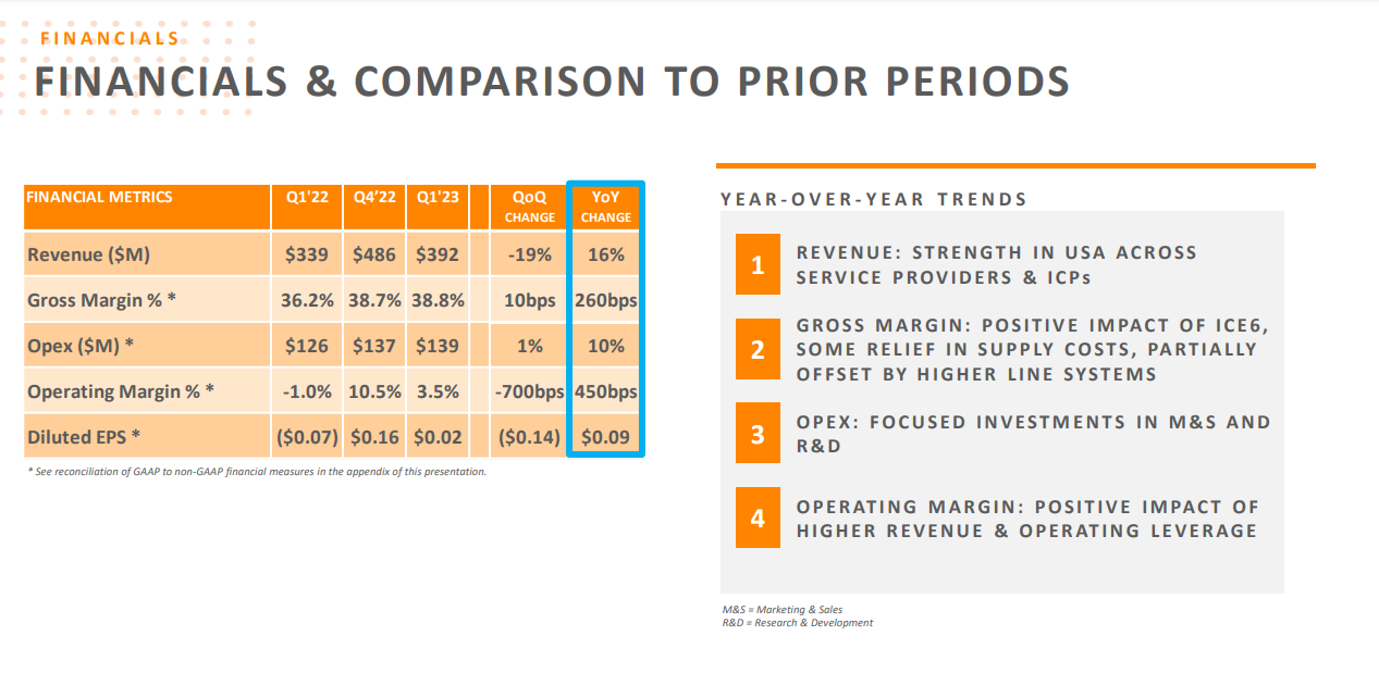 2023年第一季度,Infinera GAAP銷售收入3.92億美元,上個(gè)季度4.86億美元,去年同期3.39億美元。GAAP毛利率37.5%,上個(gè)季度37.1%,去年同期32.9%。GAAP凈虧損840萬美元,或每股虧損0.04美元;上個(gè)季度GAAP凈收益3350萬美元,或每股收益0.14美元;去年同期GAAP凈虧損4190萬美元,或每股虧損0.2美元。