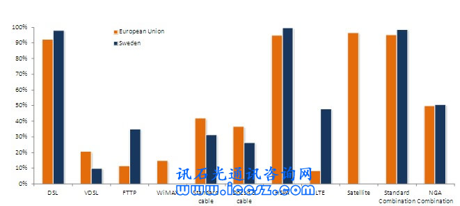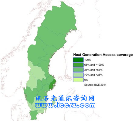 《2011歐洲寬帶覆蓋》調(diào)研報告顯示,瑞典基本寬帶覆蓋率(至少提供144kbps的服務,只要他們愿意)達99%,超高速寬帶(也稱為NGA,即下一代接入)覆蓋接近51%。在調(diào)研的29個國家中(歐盟27國和挪威、冰島),96%能夠獲得基本寬帶,超過50%(一半國家走向2020數(shù)字天堂目標)能夠獲得超高速。