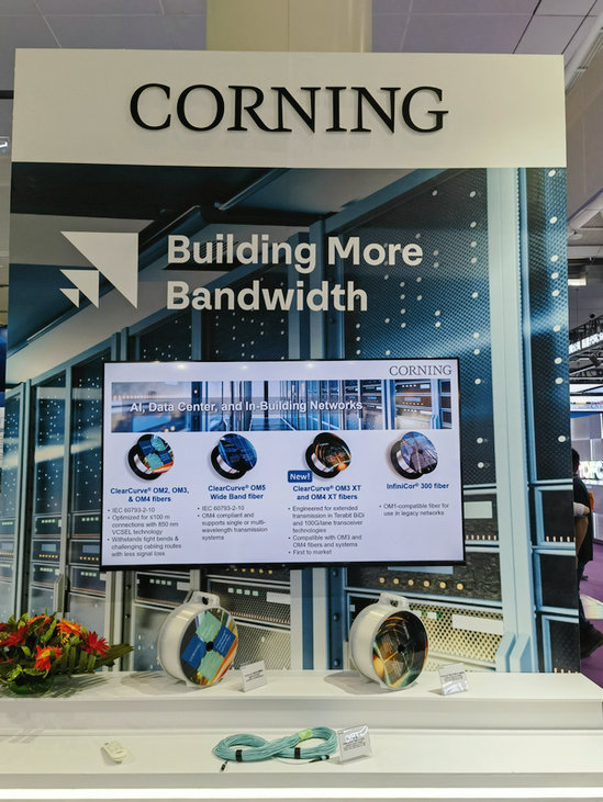 另一個方面,我們根據(jù)中國的光網(wǎng)絡(luò)的特性,開發(fā)了一些面向國內(nèi)客戶的產(chǎn)品。例如在AI應(yīng)用中,客戶希望在100米的短距連接中更多的使用多模連接方案,以實現(xiàn)更低的總成本和更低的能耗。康寧率先在業(yè)內(nèi)提出了HDROM4的概念,并在去年的CIOE發(fā)布了Corning®ClearCurve® OM4 XT 光纖,對850~910nm波長范圍內(nèi)都進行了帶寬優(yōu)化,滿足整個波長范圍內(nèi)單通道100G 100米的傳輸距離,有力的支持了國內(nèi)智算中心的建設(shè)。