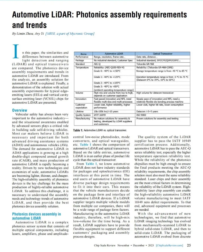 MRSI(Mycronic集團)周利民博士、易英杰先生日前在權威雜志Chip Scale Review聯(lián)合發(fā)表并分享了"汽車激光雷達-光電子封裝要求和趨勢"的文章。文章主要介紹了汽車激光雷達的光電器件封裝要求和發(fā)展趨勢。在此基礎上,給出了一種汽車激光雷達的封裝解決方案。最后,通過典型的汽車激光雷達邊緣發(fā)射激光器(EELs)和垂直腔面發(fā)射激光器(VCSEL)芯片的實際封裝實驗驗證了該解決方案。