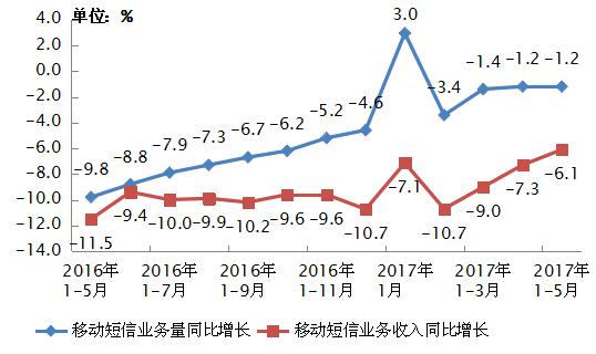 圖72016-2017年5月移動短信業(yè)務量和收入同比增長情況