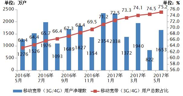圖3 2016-2017年5月移動寬帶用戶當月凈增數(shù)和總數(shù)占比情況