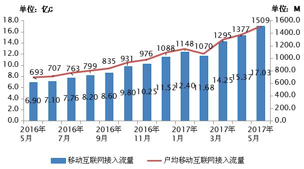 圖82016-2017年5月當月移動互聯(lián)網接入流量和戶均流量比較