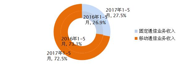 圖2 2017年1-5月電信業(yè)務收入結構占比情況(固定和移動)
