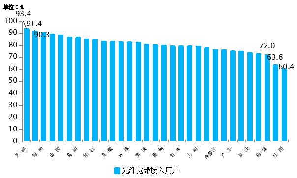 5月末,東、中、西部地區(qū)光纖寬帶接入用戶分別達到12932萬戶、6669萬戶和5931萬戶,用戶滲透率中部地區(qū)領先,達到81.2%,東部、西部地區(qū)分別為79.7%和80.4%,各省間光纖寬帶接入用戶占比差異呈縮小態(tài)勢,天津、河北和河南分別居全國前三位,占比均超過90%。