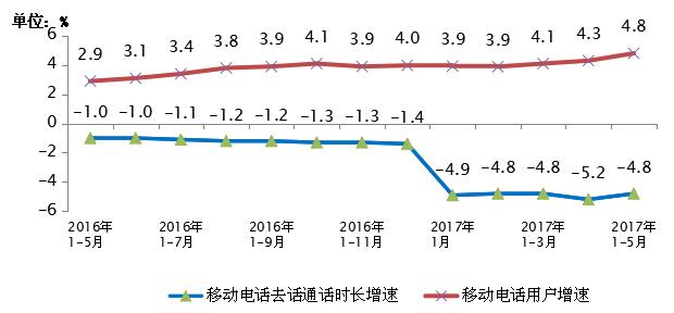 圖62016-2017年5月移動電話用戶和通話量增幅比較