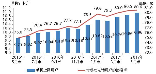 圖5 2016-2017年5月手機上網用戶和對移動電話用戶滲透率情況