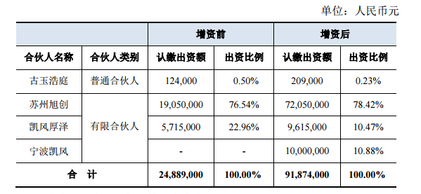 蘇州旭創(chuàng)作為投資基金的有限合伙人,本次增資后,其出資額由1,905萬元變更為7,205萬元,占投資基金的78.42%。