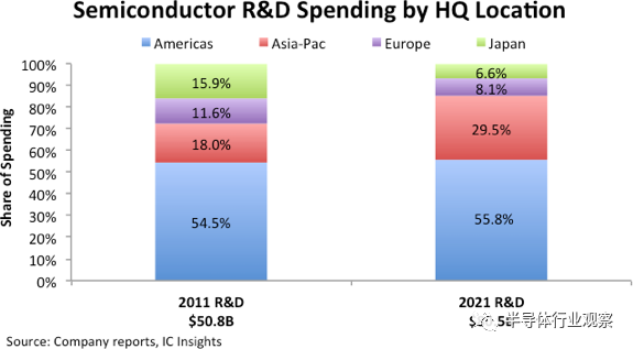 2021 年,總部位于美洲地區(qū)的公司的研發(fā)支出占半導體銷售額的百分比平均為 16.9%。2021 年亞太地區(qū)半導體供應商的研發(fā)與銷售比率為 9.8%,而歐洲公司的研發(fā)方面的支出約為他們?nèi)ツ晔杖氲?4.4%。根據(jù) IC Insights 當前的更新報告,日本半導體公司在 2021 年的總研發(fā)/銷售比率為 11.5%。