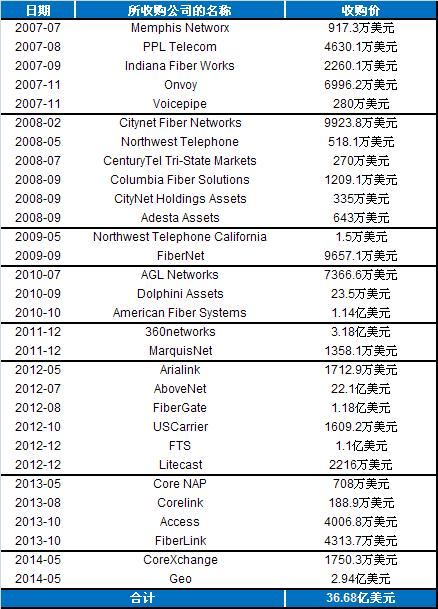ICCSZ訊(編譯:Nina)上周三(2014年7月2日),美國光纖網(wǎng)絡(luò)公司Zayo集團(tuán)向美國證交會(SEC)提交了IPO申請。這家Wholesale服務(wù)專家在業(yè)界以其收購之頻而聞名。從2007年7月到2014年5月的近七年之間,Zayo完成了30次收購,其收購規(guī)模有小到1.5萬美元(2009年5月,North Telephone California),也有大到22.1億美元(2012年7月,AboveNet),總共耗資約37億美元。