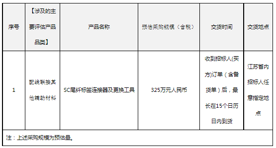 ICC訊 (編輯:Anton) 4月25日,中國(guó)電信股份有限公司江蘇分公司發(fā)布2022年SC尾纖標(biāo)簽連接器及更換工具采購(gòu)項(xiàng)目招標(biāo)公告,擬采購(gòu)SC尾纖標(biāo)簽連接器及更換工具約325萬(wàn)元人民幣。本項(xiàng)目為集中招標(biāo),不劃分標(biāo)包。