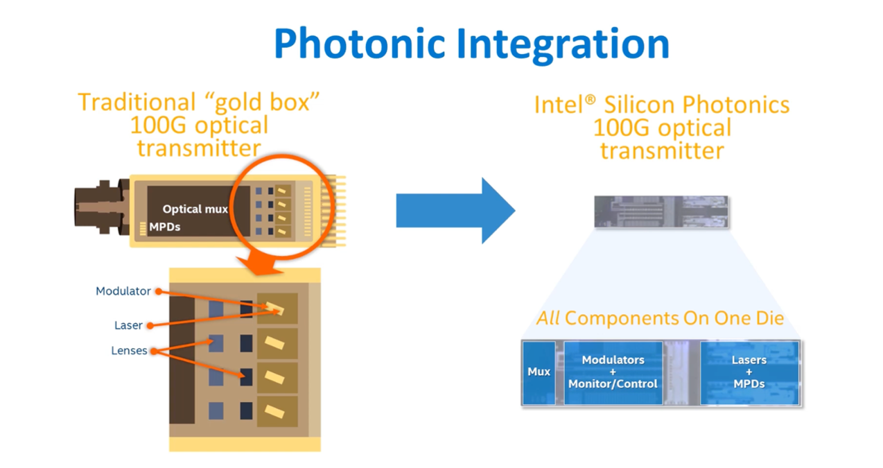 硅光技術(shù)最大的特點(diǎn)在于它的高集成性上,將光學(xué)元件與電子元件集成到一個(gè)單獨(dú)的芯片上,融合光電信號(hào)的處理。傳統(tǒng)的光模塊發(fā)射器采用的是Gold-Box這樣的封裝方式,而英特爾的硅光集成技術(shù)將所有元件集成在一起,Mux、調(diào)制器和激光都位于一個(gè)晶片上。如此一來(lái)不僅可以實(shí)現(xiàn)更低的成本,也能做到更大的量產(chǎn)規(guī)模。