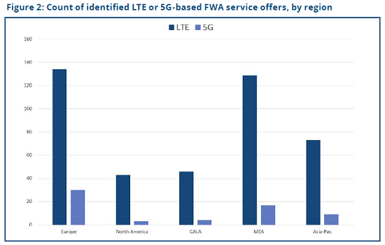 使用LTE或5G提供FWA服務(wù)的運(yùn)營(yíng)商數(shù)量因地區(qū)而異。在歐洲銷售FWA服務(wù)的運(yùn)營(yíng)商比其他任何地區(qū)都多,緊隨其后的是中東和非洲。運(yùn)營(yíng)商是否提供服務(wù)將取決于多種因素:國(guó)家或地區(qū)的固網(wǎng)寬帶服務(wù)覆蓋程度,是否有許多偏遠(yuǎn)地區(qū)沒有寬帶或?qū)拵Э捎眯暂^差,該運(yùn)營(yíng)商是否運(yùn)營(yíng)固定網(wǎng)絡(luò),從技術(shù)角度來看該網(wǎng)絡(luò)有多先進(jìn),以及其競(jìng)爭(zhēng)對(duì)手是否推出了FWA服務(wù)。當(dāng)一家運(yùn)營(yíng)商推出固定無線家庭寬帶服務(wù)時(shí),其競(jìng)爭(zhēng)對(duì)手似乎通常會(huì)迅速跟進(jìn)。