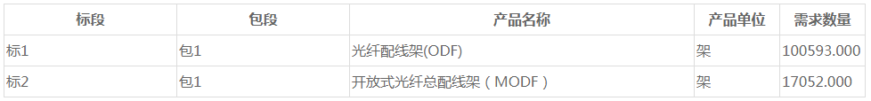 招標內容: 本項目為集中招標項目。本次采購光纖配線架產品共計約10.06萬架、光纖總配線架產品共計約1.71萬架,采購滿足期為1年。實際采購量以采購合同為準。