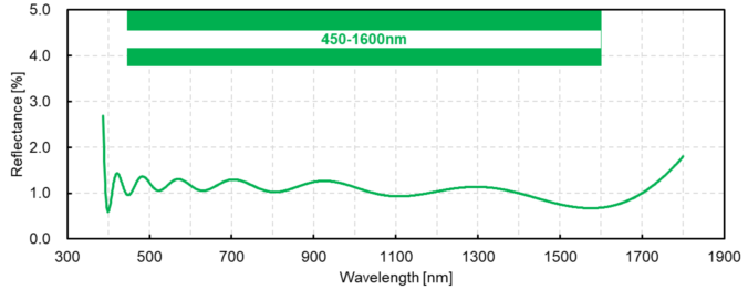 圖5. 450 – 1600 nm寬帶AR鍍膜的反射率 (angle: 0 degree).