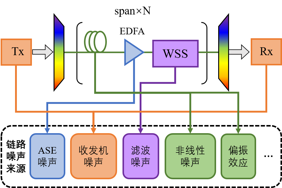 圖中所示的這些噪聲作用于信號的時、頻域,其大小與信號配置、波道分布、光纖類型都密切相關。對于這些噪聲的單獨建模存在一定的復雜性,但都有可行的方案。目前常用的兩種QoT評估框架:高精度的基于分步傅里葉的估計模型(split-step Fourier method,SSFM)和快速的基于高斯噪聲假設的估計模型(Gaussian noise model, GN model),都可以在假設各項噪聲為加性噪聲的情況下,給出鏈路中噪聲的評估總和。目前關于各項噪聲建模的研究很多,但仍然存在改進的空間,尤其是針對靈活彈性光網(wǎng)絡的應用場景。