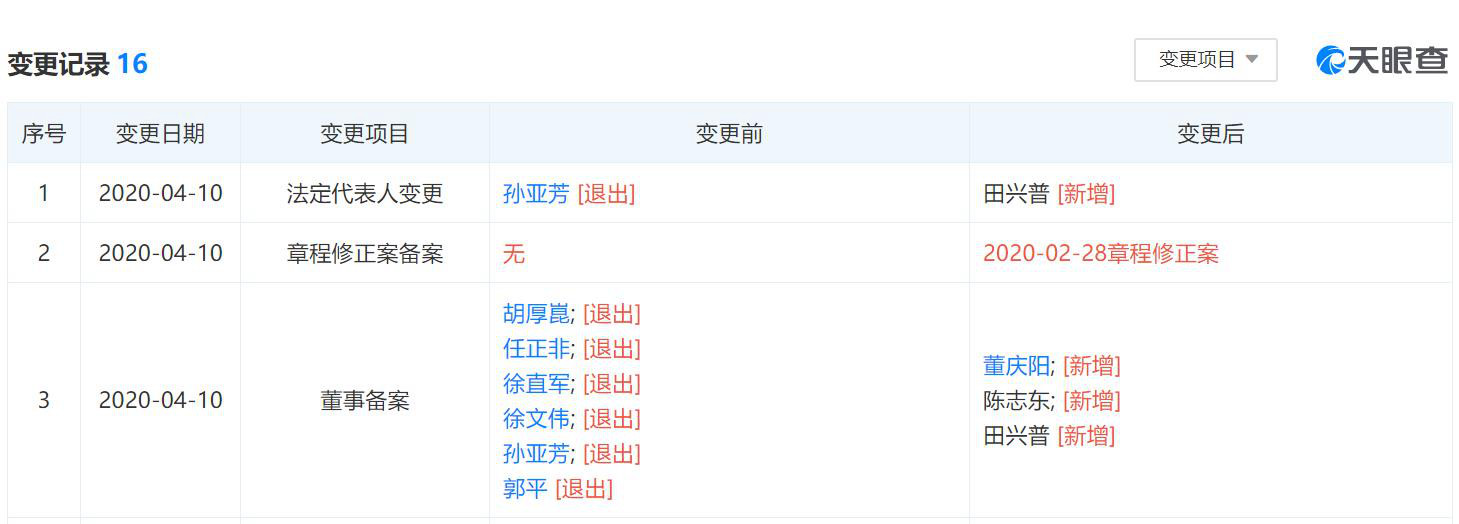 原法定代表人孫亞芳卸任,由田興普接任。任正非、胡厚崑、徐直軍、徐文偉、孫亞芳、郭平卸任董事,新增董慶陽(yáng)、陳志東、田興普為董事。