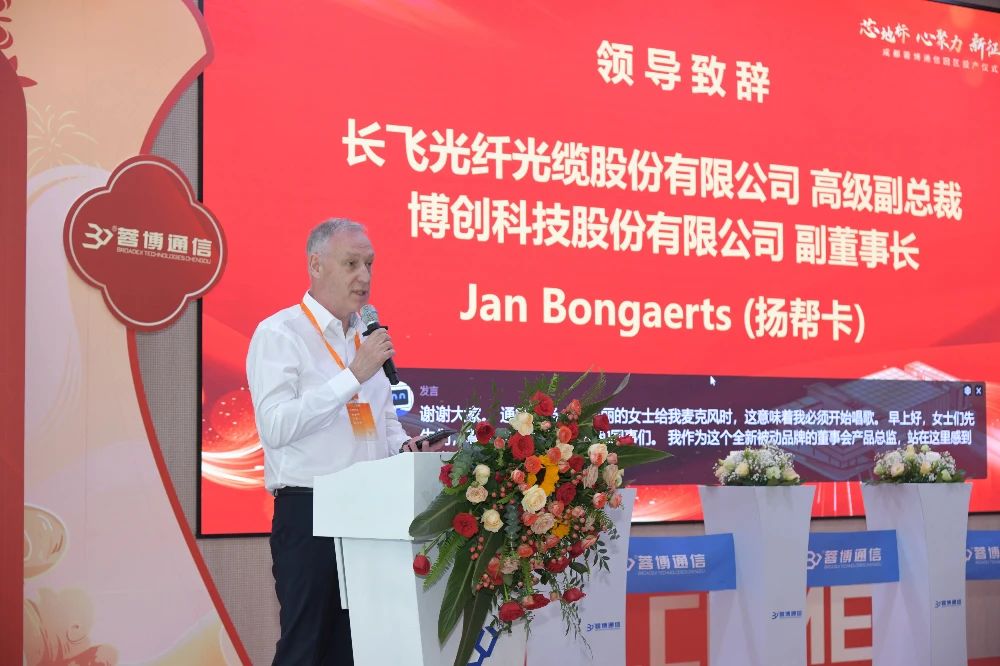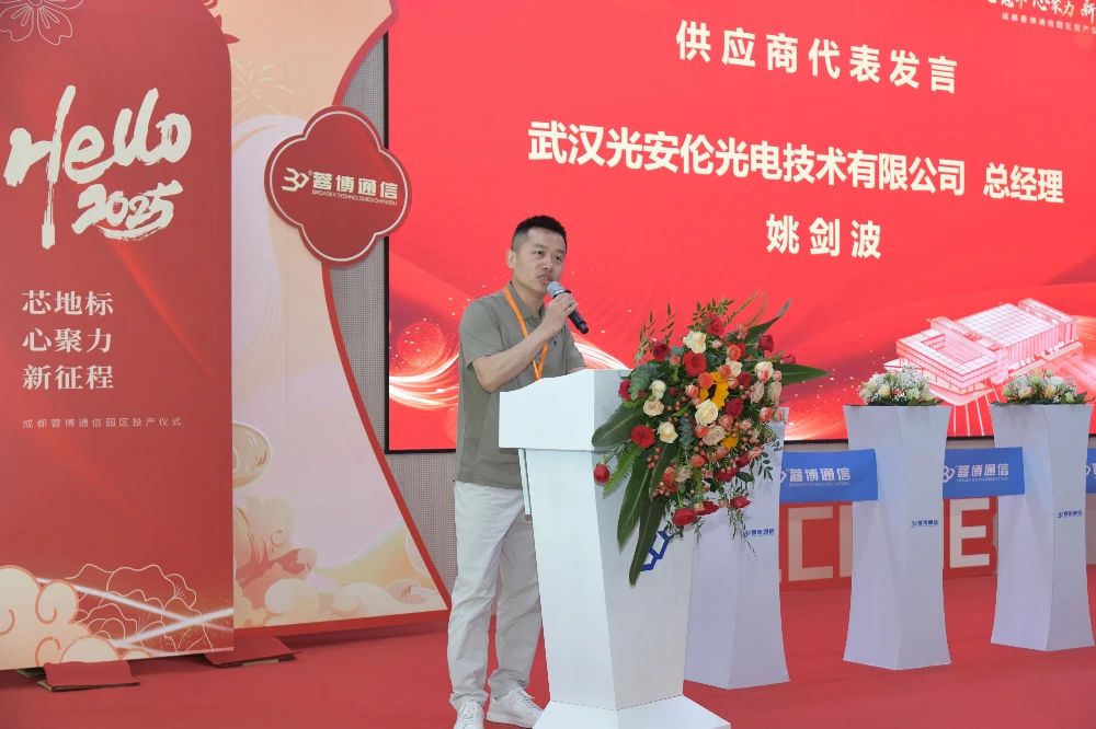 長飛公司執(zhí)行董事兼總裁、博創(chuàng)科技董事長莊丹,長飛公司高級副總裁、博創(chuàng)科技副董事長揚(yáng)幫卡,博創(chuàng)科技總經(jīng)理、蓉博董事長湯金寬,蓉博總經(jīng)理段義鵬,江蘇華暉建設(shè)總經(jīng)理黃暉,武漢光安倫總經(jīng)理姚劍波等受邀出席并發(fā)表致辭,與蓉博員工齊聚一堂,共同見證這一凝聚智慧與汗水的重要時刻。