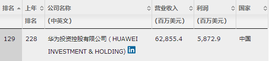 ICCSZ訊 北京時間7月20日晚,財富中文網與全球同步發(fā)布了最新的《財富》世界500強排行榜。華為以628.55億美元營業(yè)收入再度上榜,排名第129位,較上一年的第228位跨越式提升近百名。主設備商中,愛立信排名第357位。