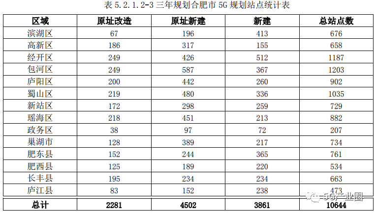規(guī)劃顯示,2019-2021年,合肥市共計(jì)新建5G站點(diǎn)10644個(gè),其中原址改造2281個(gè),原址新建4502個(gè),新建站點(diǎn)3861個(gè),各區(qū)分布如下表: