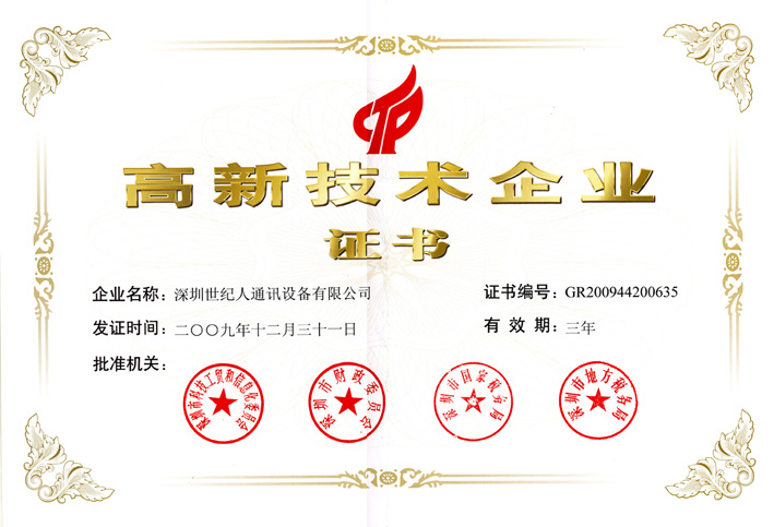 世紀(jì)人通訊設(shè)備有限公司作為深圳市2009年第三批企業(yè),被認(rèn)定為